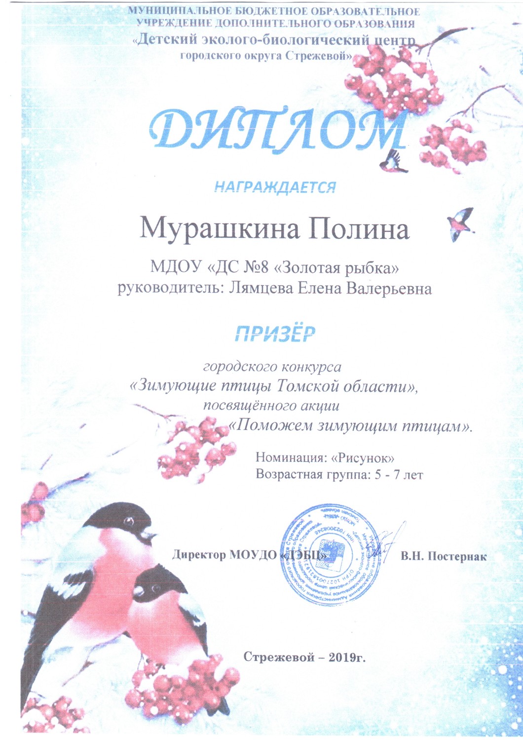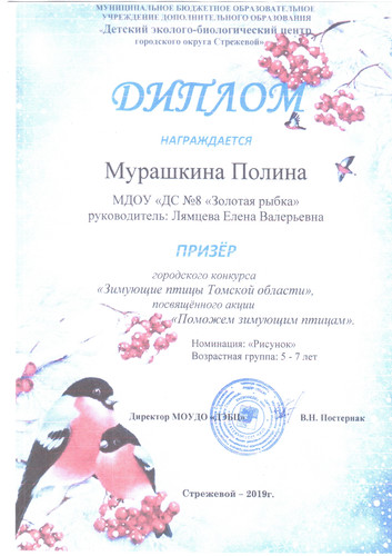 2. МБОУ ДО "Детский эколого-биологический центр городского округа Стрежевой", Городской конкурс "Зимующие птицы Томской области", в номинации "Рисунок", посвященному акции "Поможем зимующим птицам", диплом призера, 2019 г.