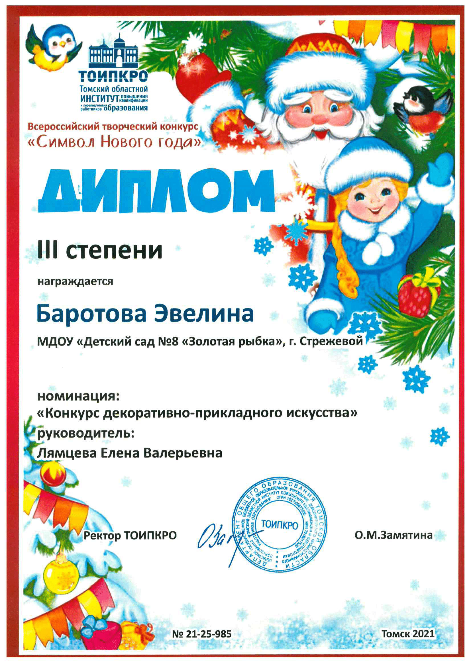7. ТОИПКРО, Всероссийский творческий конкурс "Символ Нового года!", номинация "Конкурс декоративно-прикладного искусства", диплом ||| степени, 2021 г.