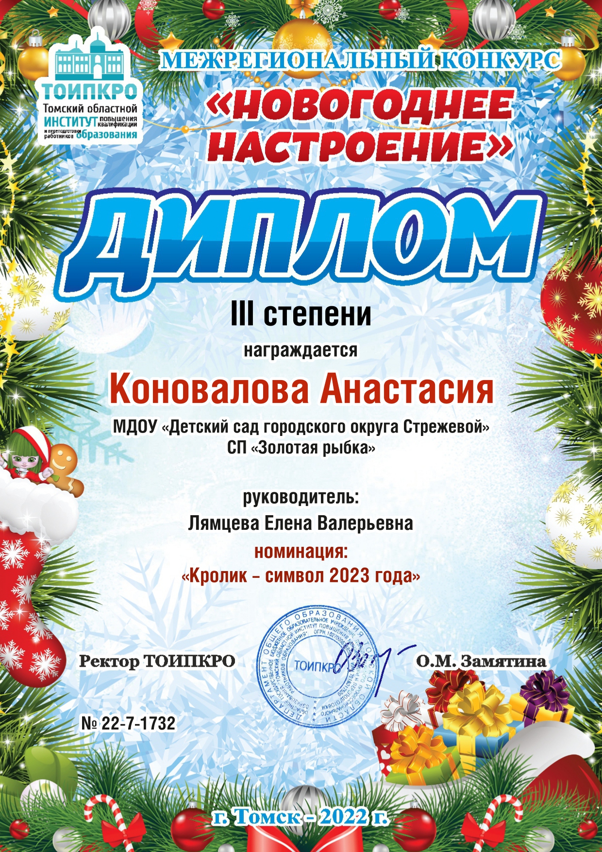 12. ТОИПКРО, Межрегиональный конкурс "Новогоднее настроение", номинация "Кролик - символ 2023 года", диплом ||| степени, 2022 г.