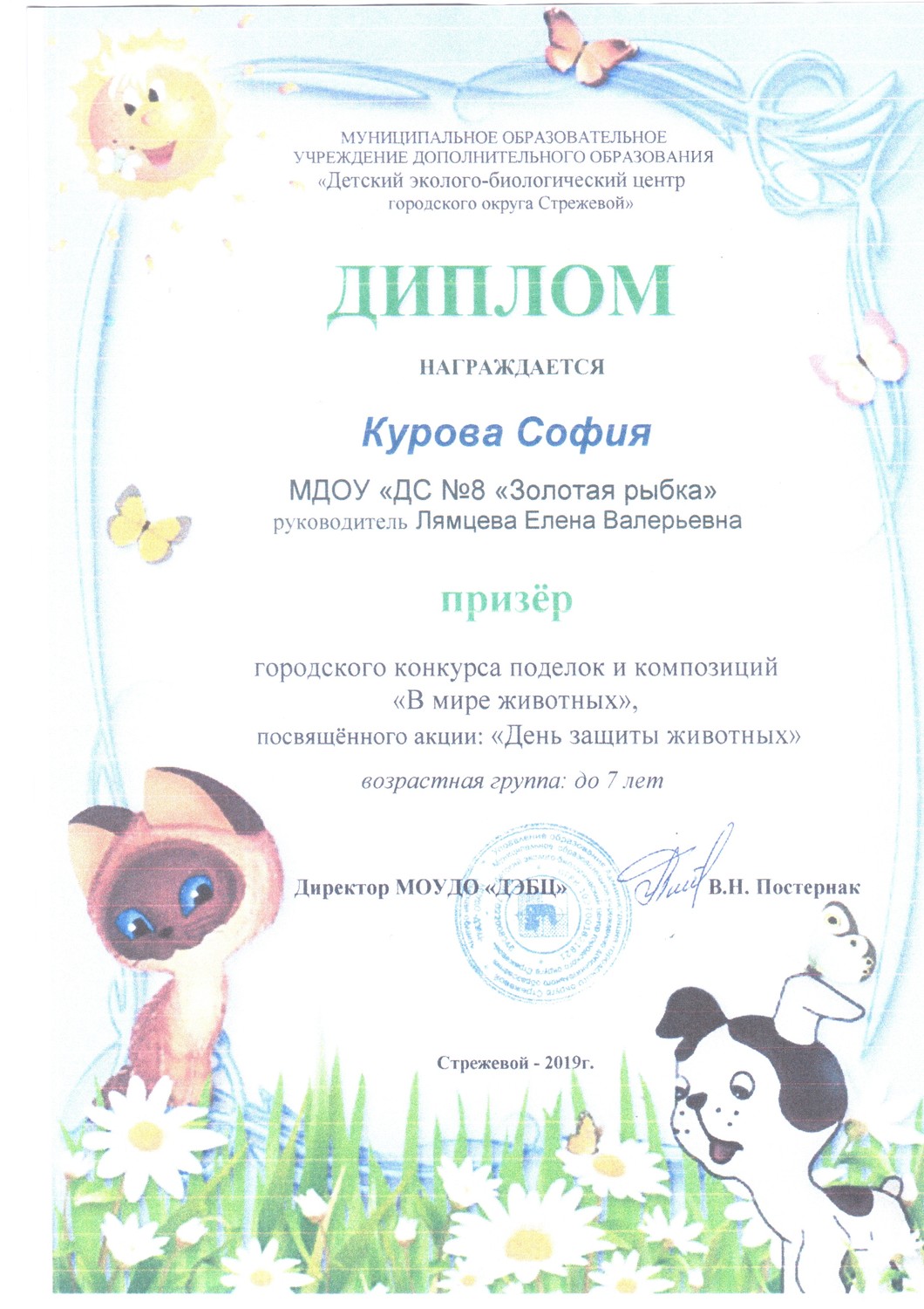 3. МБОУ ДО "Детский эколого-биологический центр городского округа Стрежевой", Городской конкурс "День защиты животных", посвященного акции "День защиты животных", диплом призера, 2019 г.