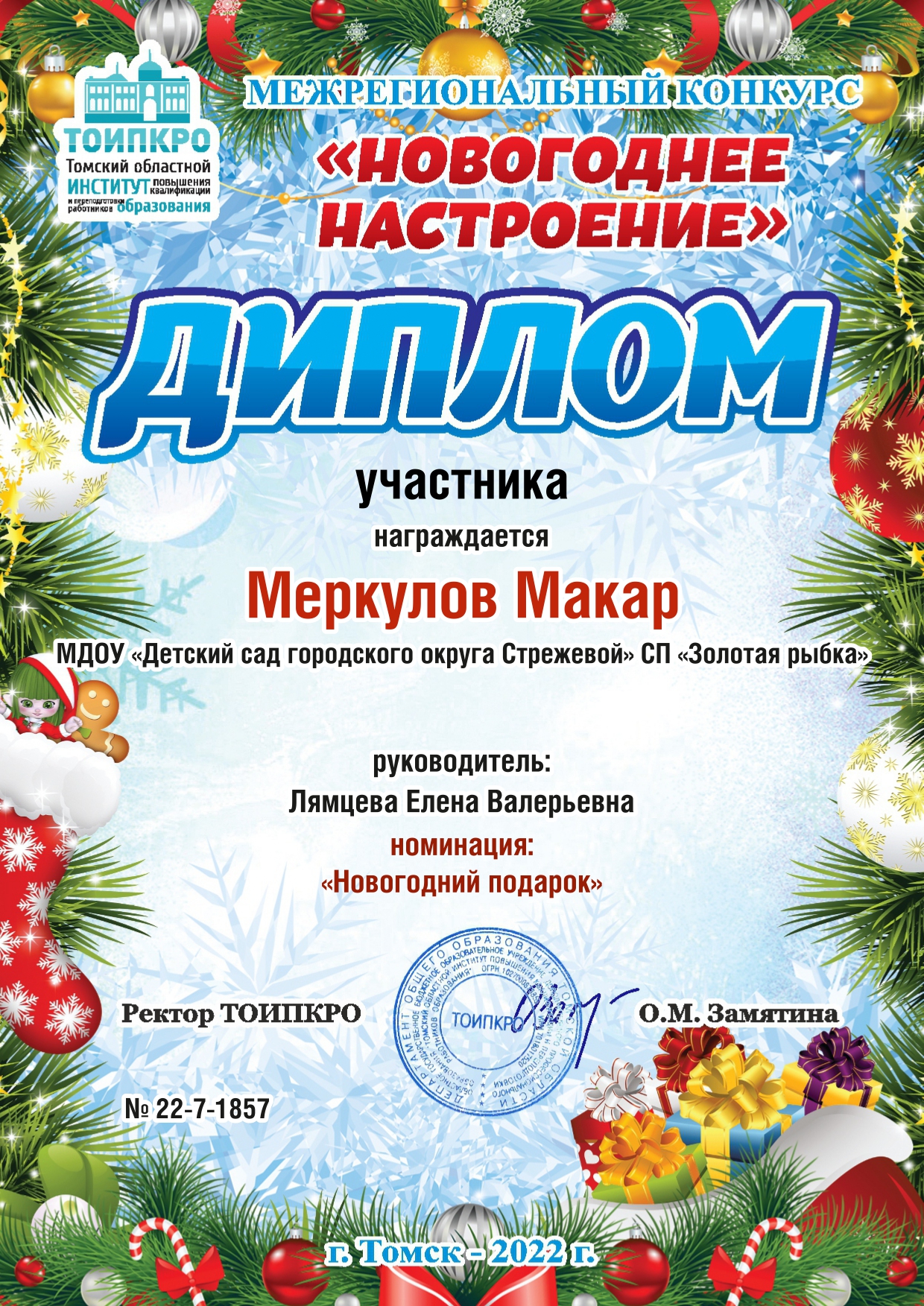 11. ТОИПКРО, Межрегиональный конкурс "Новогоднее настроение", номинация "Новогодний подарок", диплом участника, 2022 г.