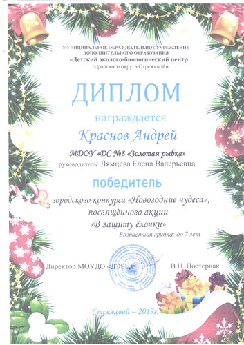 1. МБОУ ДО "Детский эколого-биологический центр городского округа Стрежевой", Городской конкурс "Новогодние чудеса", посвященному акции "В защиту Ёлочки", диплом победителя, 2019 г.