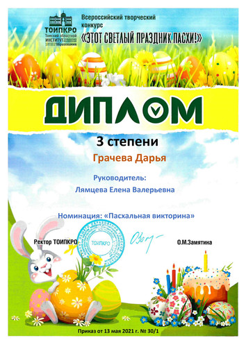 5. ТОИПКРО, Всероссийский творческий конкурс "Этот светлый праздник Пасхи!", номинация "Пасхальная викторина", диплом ||| степени, 2021 г.