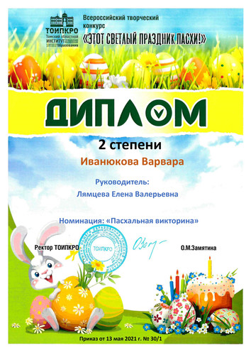 4. ТОИПКРО, Всероссийский творческий конкурс "Этот светлый праздник Пасхи!", номинация "Пасхальная викторина", диплом || степени, 2021 г.