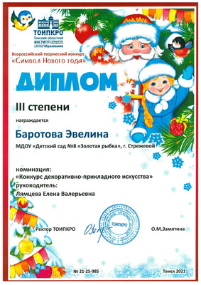 8. ТОИПКРО, Всероссийский творческий конкурс "Символ Нового года!", номинация "Конкурс декоративно-прикладного искусства", диплом ||| степени, 2021 г.
