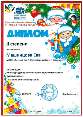 6. ТОИПКРО, Всероссийский творческий конкурс "Символ Нового года!", номинация "Конкурс декоративно-прикладного искусства", диплом || степени, 2021 г.