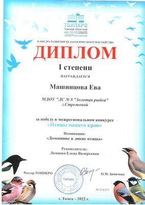 8. ТОИПКРО, Межрегиональный конкурс "Птицы нашего края", номинация "Домашние и дикие птицы", диплом | степени, 2022 г.