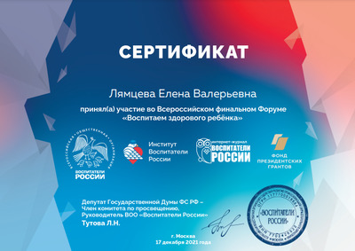 Получила сертификат за онлайн участие 17.12.21 г. во Всероссийском финальном Форуме "Воспитаем здорового ребёнка"