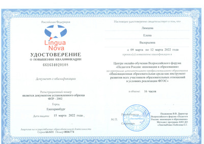 В период с 3 по 12 марта 2022 года в Центр онлайн-обучения Всероссийского форума "Педагоги России: инновации в образовании", освоила программу "Инновационная образовательная среда как инструмент развития всех участников образовательных отношений в условиях реализации ФГОС" в количестве 16 часов